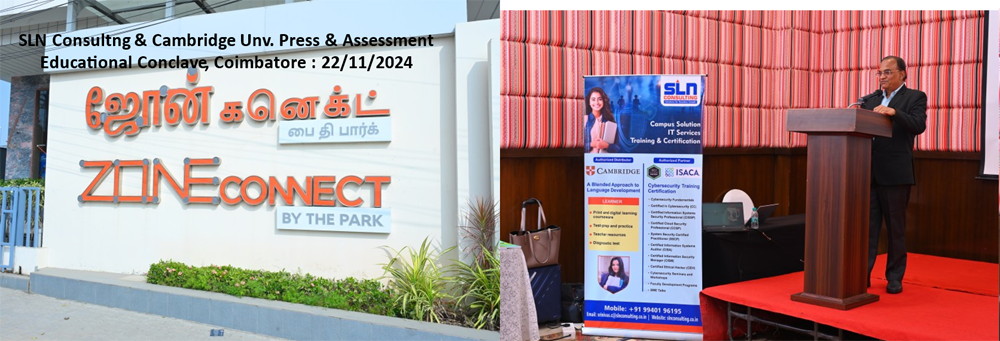 We are thrilled to share the success of our recent Educational Conclave, held on November 22, 2024, in Coimbatore. Jointly or ganized by SLN Consulting and Cambridge University Press & Assessment (CUP&A), the event brought together thought leaders and Academic Institution Heads from over 20 premier institutions for a me aningful discussions and collaboration. On the theme "Preparing learners For the 21st Century". The event featured a compelling presentation by Ms. Ruchi Tomar, Principal Trainer and Mentor, CUP&A, who inspired the audience w ith her insights on preparing students for 21st -century careers. She highlighted the pivotal role of Cambridge programs and courses in equipping students with the skills they need t o survie and thrive in an evolving world. The interactive Q&A session that followed was expertly moderated, fostering engaging and thought -provoking exchanges. We are excited to share that many of the participating institutions have invited SLN Consulting to continue the conversation by visiting their campuses to explore the implementation of these programs.
